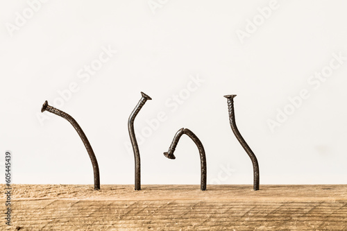 Crooked nails in a wooden board with white background. Try and fail concept.