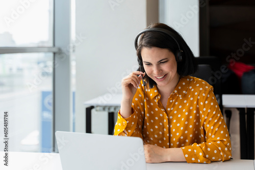 Pleasant young businesswoman, sales manager, executive director or recruiter in audio headset, sitting at table, using laptop having online meeting with partners or job interviews in office interior