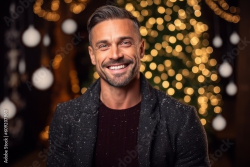 Portrait of a handsome young man in a black jacket on the background of a Christmas tree.