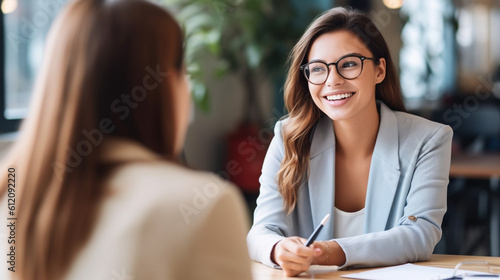 a young adult woman in a business suit, with long brunette hair, a ballpoint pen, at a desk in a large office, employees in a fictitious industry, conduct or advise or sell