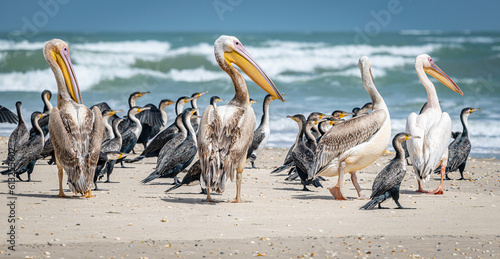 Colonia de pelícanos " Pelecanus onocrotalus" y Cormoranes Grandes " Phalacrocorax carbo" en Lengua de la Barbarie , SENEGAL