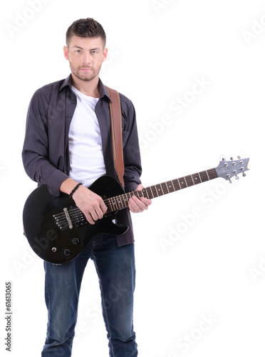 Young musician playing guitar, isolated on white