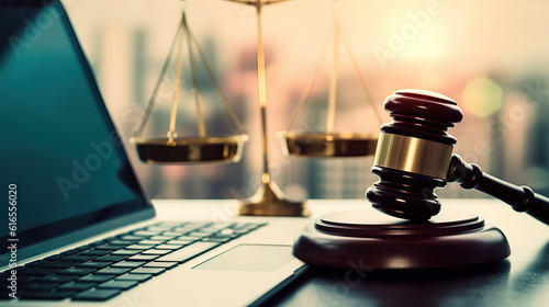 Richterhammer mit Laptop und Waage der Gerechtigkeit.