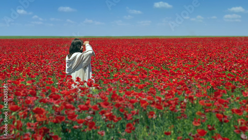 Jesus walking in a beautiful poppy field.