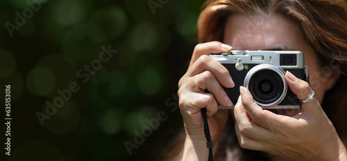 A woman taking pictures with a compact camera outdoors. Traveling and photographing concept.