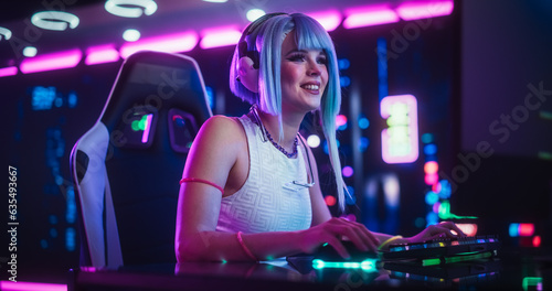 Stylish Streamer or Gamer with Blue Hair Chats with Internet Fans on Computer in Futuristic Cyber Technology Room. Footage for Social Media, Streaming, and Gaming Content
