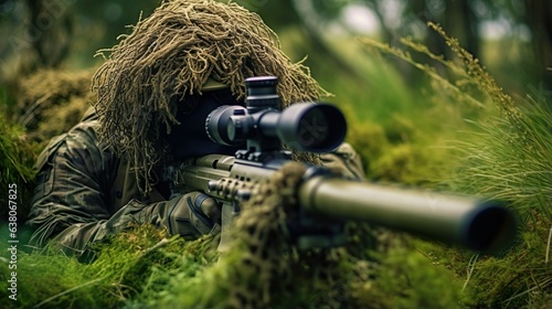 Sniper ghillie suit in ready position made with Ai generative technology, Person is fictional
