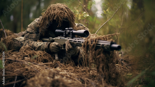 Special forces sniper soldier wearing ghillie suit laying on ground hiding with sniper gun