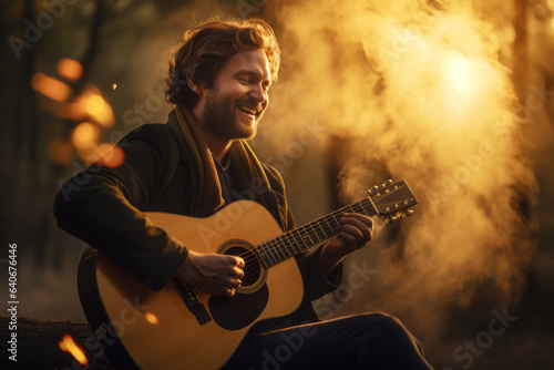 Cheerful young male musician performing for his fellow hikers on sunny fall day. Performer playing a guitar in the wild. People having fun on a hike in autumn.