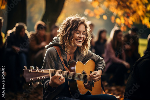 Cheerful young female musician performing for her fellow hikers on sunny fall day. Performer playing a guitar in the wild. People having fun on a hike in autumn.