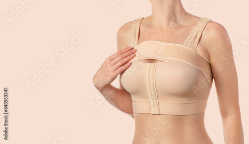 Woman wearing a compressing bra with a stipe after breast augmentation surgery.