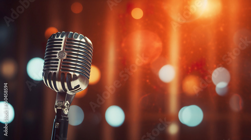Close-up view of vintage microphone with blurred stage lights in the background. Close-up view of retro microphone on empty stage.