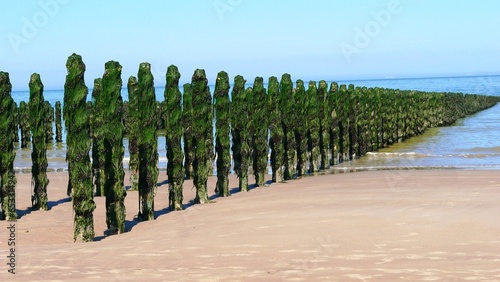 Bouchots à moules, pieux en bois, support de moules sur la plage de Tardinghen dans La Manche, côte d'opale dans le Pas-de-Calais France Europe