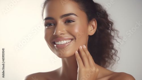 Radiant Confidence: Smiling Woman Showcasing Flawless Skin on Gray Background for Skin Care Products Advertisement.