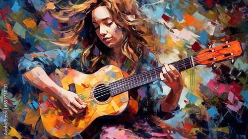 Stunning Oil Painting Liquid Art of A Beautiful Woman Guitar Player on The Canvas Abstract Background