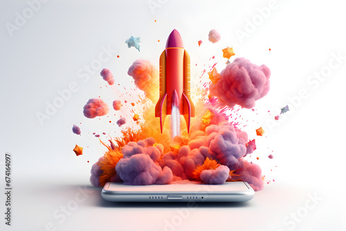A generative AI concept of a rocket launching from a mobile screen on a white background, symbolizing the idea of a cell phone startup,