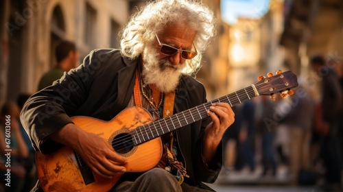 old adult mature senior old male man musician street night performance solo guitar singing music street side at old town famouse travel destination lifestlye concept