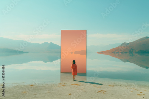 A woman standing in front of a mirror on a beach created with Generative AI technology