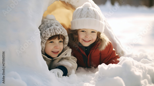 Two little children have fun playing in a snow fort on a sunny winter day. Winter retro clothes for cold weather.