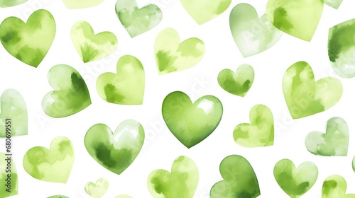 Seamless Background of painted Hearts in green Watercolors. Romantic Wallpaper