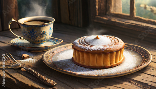 Gorąca kawa w pięknej ozdobnej filiżance stojąca na starym drewnianym stole