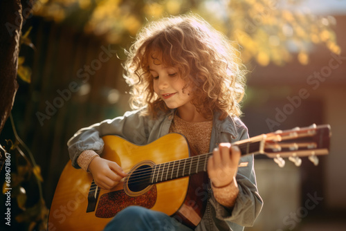 Cute little boy learning to play guitar outdoors. Child having fun with music instrument. Art education for kids.
