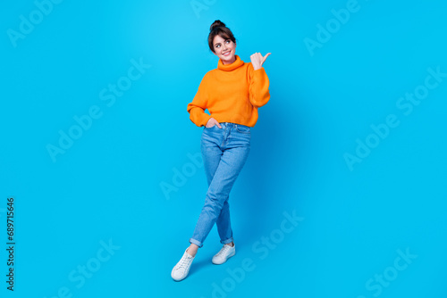 Full length photo of cheerful funky lady wear knitted pullover walking showing thumb empty space isolated blue color background