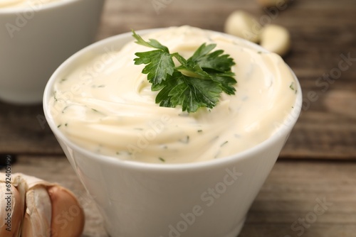 Tasty sauce with garlic and parsley on wooden table, closeup