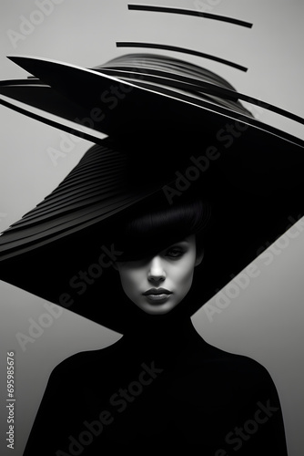 Black and white vertical image of a sophisticated woman with a big hat
