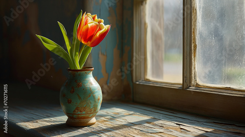 Embrace the simplicity and vibrancy of a single tulip resting in a vintage vase illuminated by soft natural light near a window. Ai generated