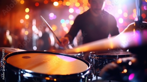 Closeup of a drummers intense expression as they play along to the virtual concert.