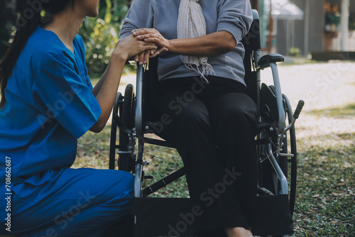 Young asian caretaker with 60s asia elderly woman consulting and encourage, take a history and recommend the right treatment to live happily in retirement, holding hands and encouraging