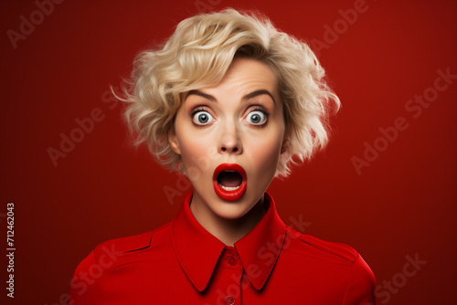 A beautiful white-haired woman with a surprised expression, eyes widened, against a striking red monochrome background.