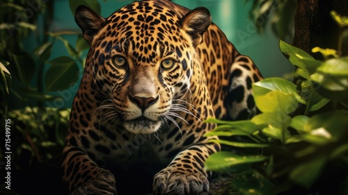 epic trees from a ground-level view in the Brazilian Rainforest, with an enchanting leaf cover and the inclusion of a Jaguar resting on a branch, showcasing the shiny realism of the big cat's eyes.