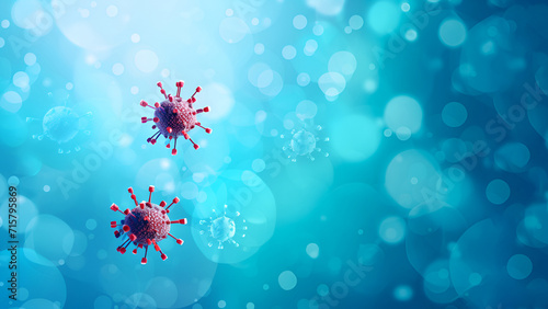 Detailed rendering of a vermilion-hued virus with influenza-like spikes and Omicron attributes on a blue gradient, space for text included. Visual for infectious diseases study.