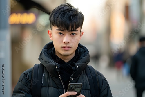 In the afternoon, short black hair, a 20-year-old asian man, wearing a black jacket, standing in the street, impassive expression, holding a mobile phone in his hand. generative AI