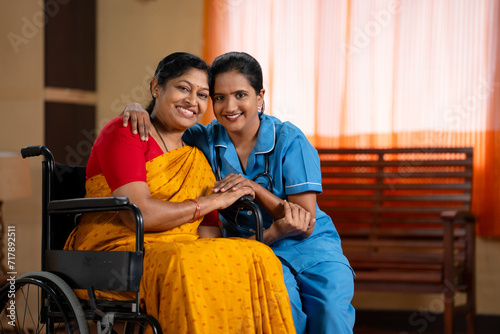 Happy recovered woman on wheelchair with caretaker looking camera at home - concept of professional occupation, healthcare assistance and compassion