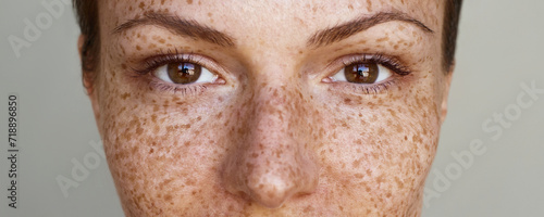 Freckles.Pigmentation. Cropped half face portrait of a young woman grey background. Natural beauty and glowing clean hydrated freckled skin.