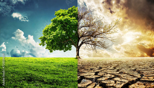 Global warming concept and climate change. Half bare tree on barren ground of a desert, and half with lush green foliage on a beautiful green meadow. Generative Ai.