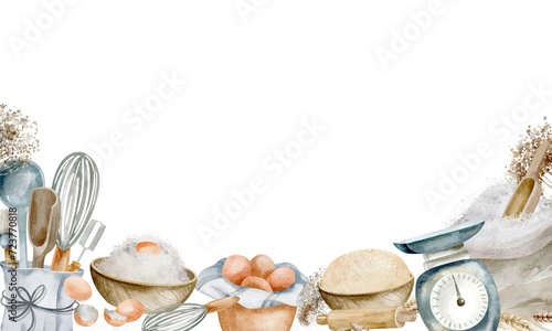 Watercolor frame kitchen utensils. Products, baking, ingredients for making homemade bread or food. Frame template for cookbook and recipes for restaurant and menu.