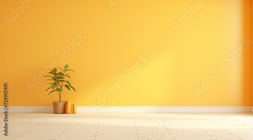 Pièce avec mur éclairé peint en jaune avec des plantes vertes, image avec espace pour texte.