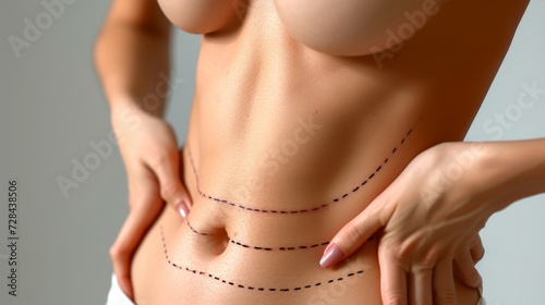 Close up of overweight woman s belly with fat pad and markers for plastic surgery obesity concept