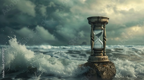 an hourglass standing atop a broken stone, positioned against the backdrop of a breathtaking seascape, highlighting the passage of time amidst the rugged beauty of nature.