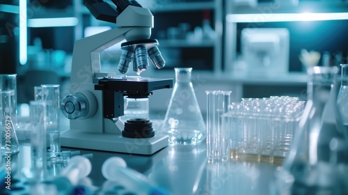 Microscope and test tubes on a table. Ideal for scientific research and laboratory experiments