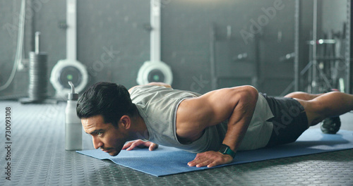 Fitness, man and pushups for muscle, exercise or training workout for strength or power at the gym. Athletic male in sport exercising lifting body with arms on the floor for strong muscles indoors