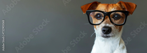 A cute and clever dog wearing a pair of oversized black glasses, posing on a grey background with space for text. The intelligent look adds an endearing touch to the image.