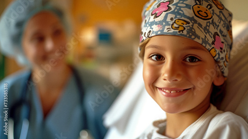 A brave young child smiling while receiving chemotherapy treatment, with a pediatric oncology nurse by their side, offering encouragement and care.