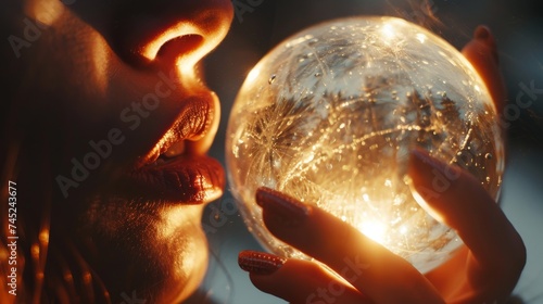 Close-up on a fortune tellers lips as they whisper ancient incantations, a faint glow emanating from the crystal ball before them