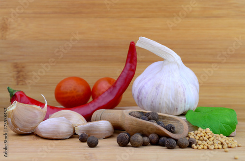 Przyprawy, czosnek, pomidorki, zestaw