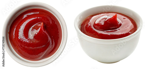 White bowl with red ketchup dip, side and top view, isolated on a transparent background, food bundle